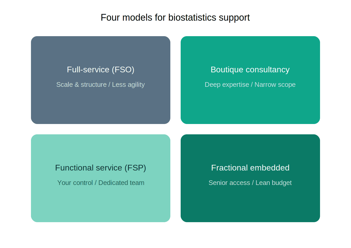 When outsourcing your biostatistics, you are choosing between four fundamentally different operational structures. Each carries distinct trade offs regarding cost, control, and depth of expertise.