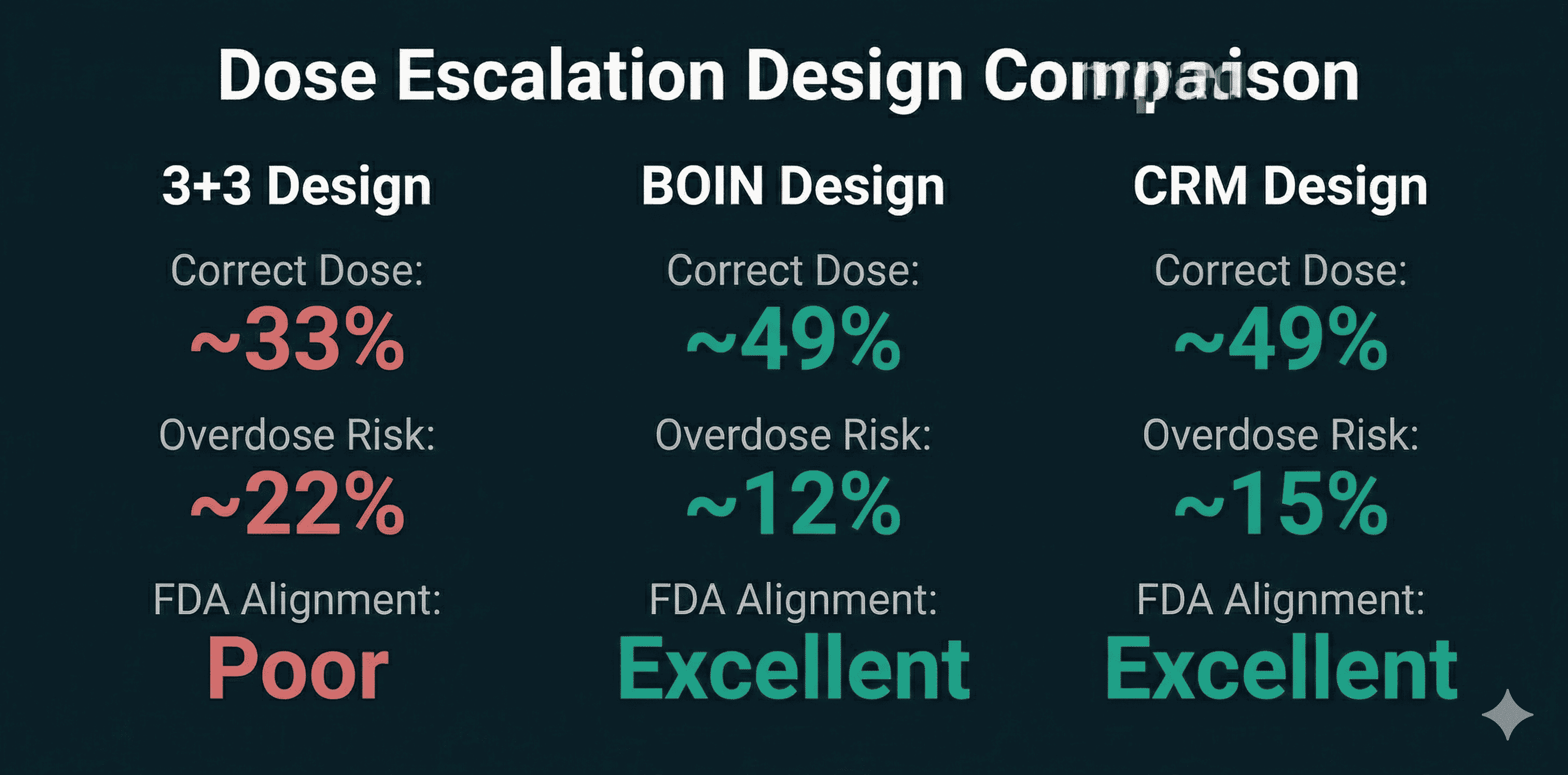 The numbers are not kind to 3+3. Simulations consistently show it identifies the correct target dose only about 33% of the time. Roughly 22% of patients end up at overdose levels. Model-assisted designs like BOIN or mTPI do significantly better — around 49% correct dose selection, with far fewer patients exposed to toxic doses.